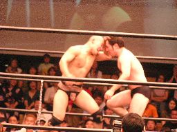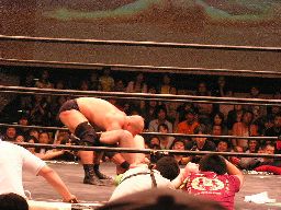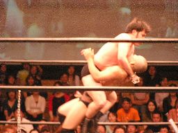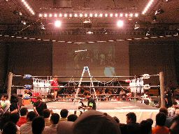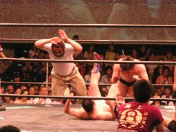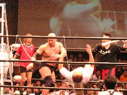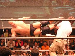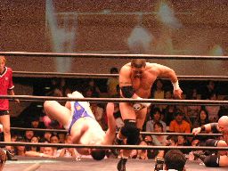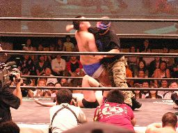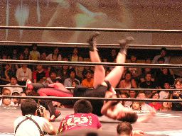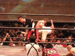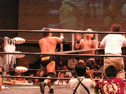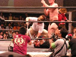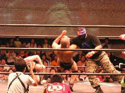 コーナーに上ってダイビングセントーン(右写真)、高木・ポイズン・ディーノ3人カット。
