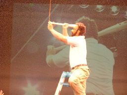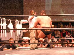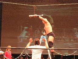 高木はクバーノを客席に投げ込みさらにクローズライン(右写真)。クバーノが控え室方向に消えて行く。