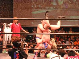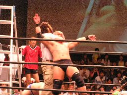 マエストロが猪俣にゴッドスリーパー(左写真)、ラダー下に寝せる。東郷がラダーに上る。15分経過。