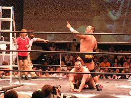 高木が本多にサンダーファイヤーパワーボム(右写真)、東郷がカット。