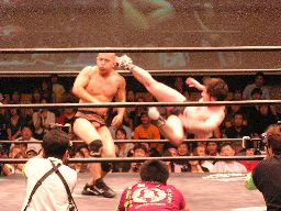 高木とマエストロはバットと傘でチャンバラ。木製バットの前には傘圧倒的不利。あっさり破壊され柄が客席まで飛んで行く。高木はバット攻撃をかわしてドロップキック(左写真)。