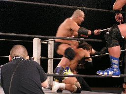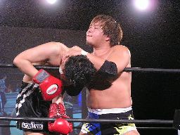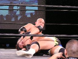 健心トルネードボム狙う、高木着地、両者ロープに走る、高木テーズプレス(左写真)、マウントパンチからエルボードロップ、鳥羽にタッチ。