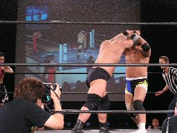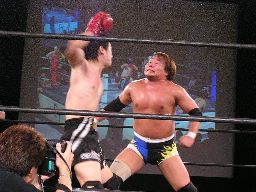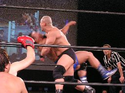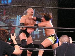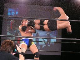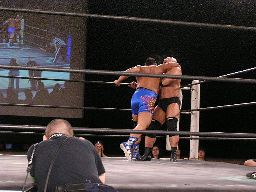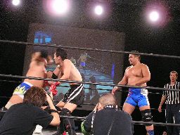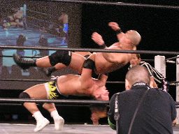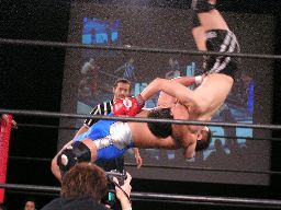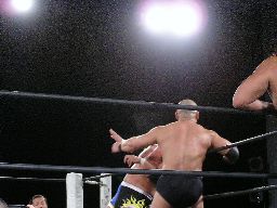 高井突っ込む、高木かわしてカニばさみ、ロープに飛んでヒップドロップ(右写真)。高木ジャーマンのお返し、ちょっと低空。両軍タッチ。