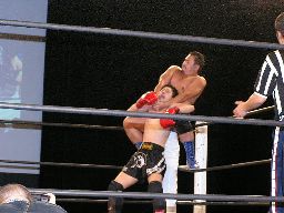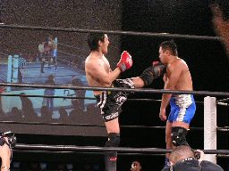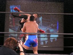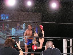 高井が入る、鳥羽も入る。高井は鳥羽のバック取る、鳥羽ヒジでブレークしてオーバーヘッドキック。そしてバックブロー(右写真)、高井場外転落。