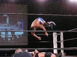 コーナーに上ってサマーソルトドロップ(右写真)、カウント2。