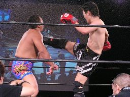 そして延髄蹴り(左写真)、高木にタッチ。高木とりあえずカバー、カウント2。