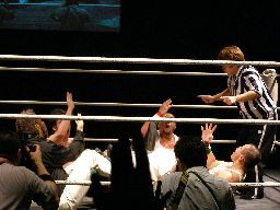 アントンストンピング、ニードロップ、カウント2。スリーパーに取る、トーゴーにタッチ。マエストロが入って足4の字、トーゴーが首4の字、アントンとベルナルドがダブルの腕十字。村杉が反則カウント「1、2、3、」4人で「フォーッ!」(左写真)