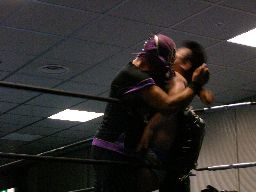 キスを狙うが宇宙が阻止。宇宙が羽交い絞め、そこに泉州がリキラリアット、しかしディーノかわし宇宙に誤爆(右写真)。