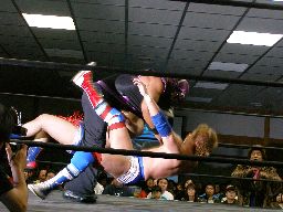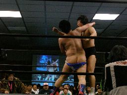 テイオーがパンチでカット(右写真)。泉州はコーナーに帰るテイオーの後頭部にラリアット。
