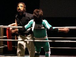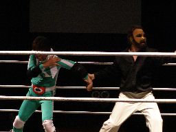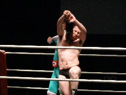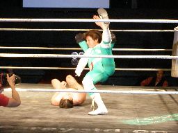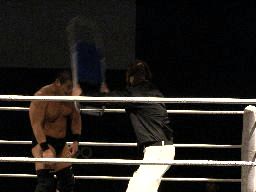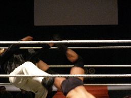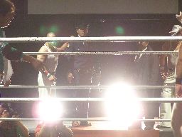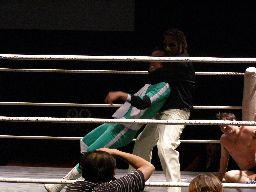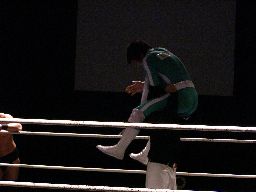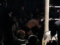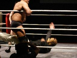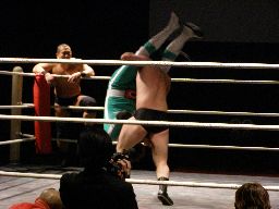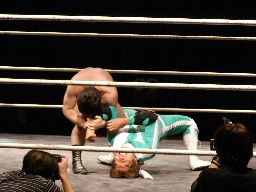 マエストロがコーナーに振って突っ込む、ゴージャスは蹴りを合わせ、マエストロに飛びつくと(左写真)空中松野チョップ、カウント2。