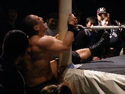マエストロはロープに固定して逆水平(右写真)、首投げから回転式ネックブリーカーに。カバーはカウント2。