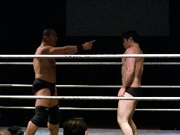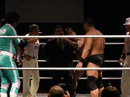高木はマエストロを首投げからスリーパー(左写真)、マエストロなんとか脱出すると高木を場外に。