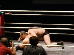 アントンが腕を固めて押し倒す、ゴージャスはブリッジで耐える(左写真)。