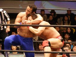 ロックアップからバックの取り合い。エルボー打ち合いから諸橋ヘッドロック(左写真)、マイケルロープに振る、諸橋ショルダーブロック。