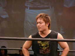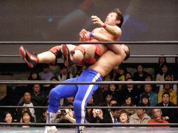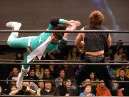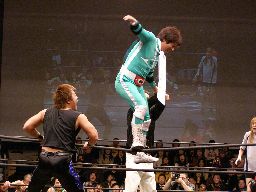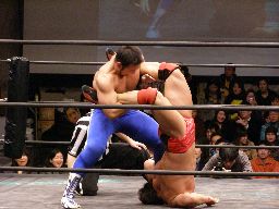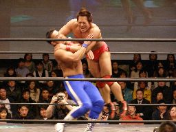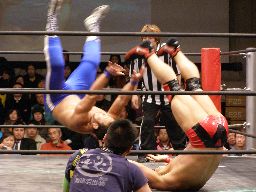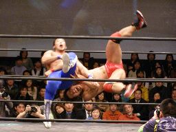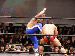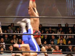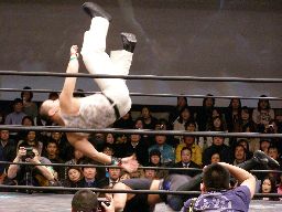 諸橋ロープに飛ぶ、マイケルリープフロッグでかわしてすくい投げ(右写真)。マイケルボディスラム、カバー、カウント2。
