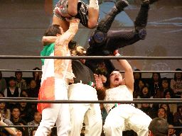 マイケルコーナーに上る、諸橋も上って雪崩式ブレーンバスター(左写真)。マイケル腰を強打。