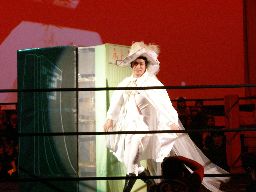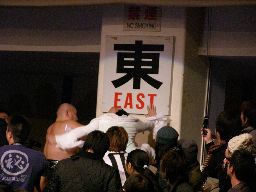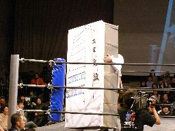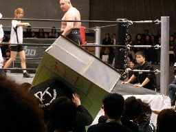 大家がもう1棟のマンションを持ってこさせる。これは会場入り口にあった「一宮選手にメッセージを」の紙が張ってあったロッカー?3人ぶつけ合う。一宮は大家を「東」の看板に何度もぶつける(左写真)と強度の十分なマンション、そして大家のマンションを積み上げた上に寝せる。
