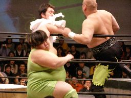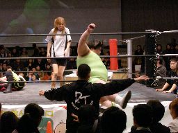 太はリングに戻ると一宮にぶーちゃんローラー(右写真)、カウント2。全員場外に。