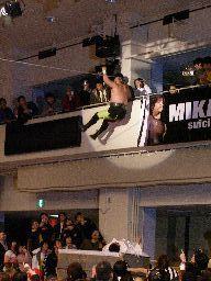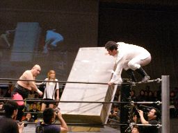 マンションの上にボードを乗せ、そこに再度大家を垂直落下式ブレーンバスター(左写真)、カウント3。