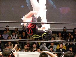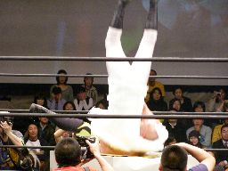 一宮は丈夫なマンションをリングに置き、その上で大家に垂直落下式ブレーンバスター(左写真)、カバーは太がカット。