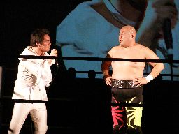 さらに一宮と大家はエルボーの打ち合い(左写真)。一宮ロープに振ってラリアット、大家かわしてスピアー。