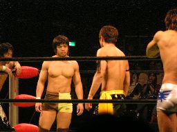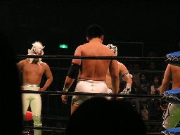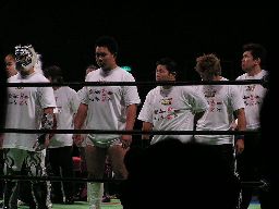 タイガーコーナーに上る、中嶋R-15で落とす。中嶋ジャーマン(左写真)、シーサーがカット。中嶋突っ込む、タイガーカニばさみで倒し619、カウント2。
