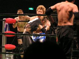 丸藤コーナーに振って串刺しエルボー、飯伏すぐにドロップキック返してKUDOにタッチ。KUDO丸藤にミサイルキック、KENTAにはミドルキック。コーナーに振る、丸藤切り返して突っ込む、KUDOかわしてジャーマン(左写真)、カウント2。
