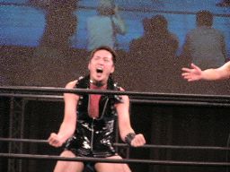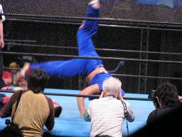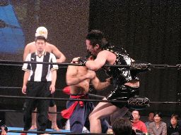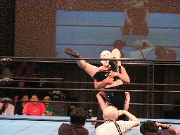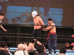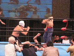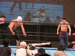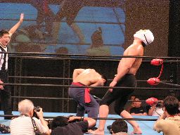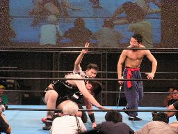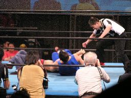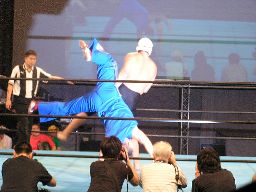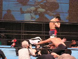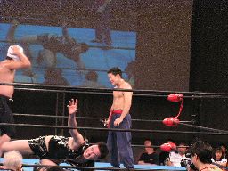 浴びせ蹴り(右写真)、カニばさみから十字、馬謖ロープ。ペドロは酒井にタッチ。