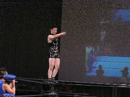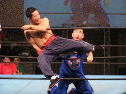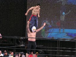 趙雲ヒジ打ち、逆水平(右写真)。ボディスラムからロープに飛んでサマーソルトドロップ、カウント2。ジャンピングフットスタンプ打ち込んで馬謖にタッチ。