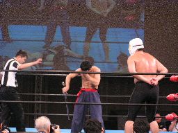 趙雲は正拳、蹴りで酒井を攻める(右写真)。酒井はヒーローちっくな動きで趙雲を裁いてペドロにタッチ。趙雲も馬謖にタッチ。