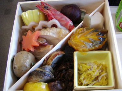 一の重。車海老艶煮は皮むいてあるのがうれしい。菊花と和えてあるのはカニだし、転んでて見えないけど海苔の佃煮にはフカヒレも入ってる。他にも錦子(干しなまこ)射込み、日向鶏の柚香焼き、蛎旨煮、栗渋皮煮、野菜の煮物、穴子八幡巻、烏賊呂焼き、ごまゆべし。