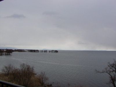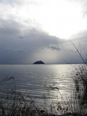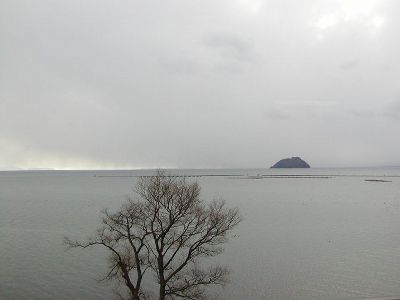 ちょっと芸術っぽく冬の琵琶湖。真ん中は竹生島。