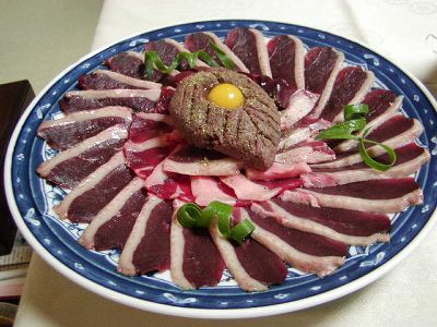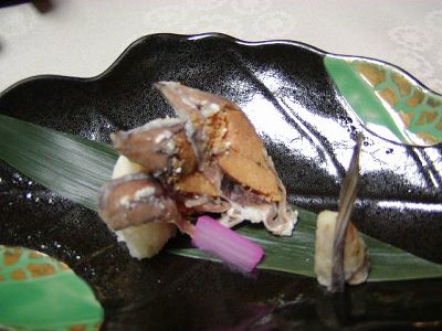 鮒寿司。初めて食べたがうまかった。チーズ苦手な人はダメだろうな。これは「はやなれ」というタイプでご飯も食べるもの。古来からある鮒寿司はご飯は発酵させるためのもので食べたりはしないらしい。