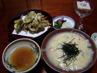 締めは三つ葉と白魚のかき揚げ、カニ雑炊。満足。