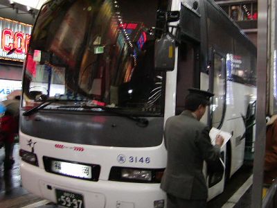 21時、ちょっと遅れて福岡行き深夜バス「はかた号」が新宿バスターミナルに入線。自分で企画したことながら、いよいよこの強敵が姿を見せるとちょっと後悔の念も。これから14時間、こいつとの闘いが始まる。