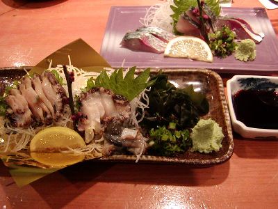 夕食は天文館の居酒屋「吾愛人」(わかな)で。まずは一口あわびと首折れサバの刺身。