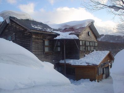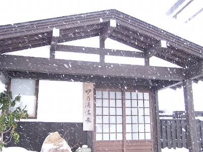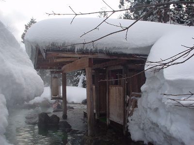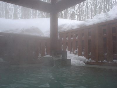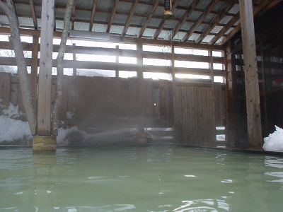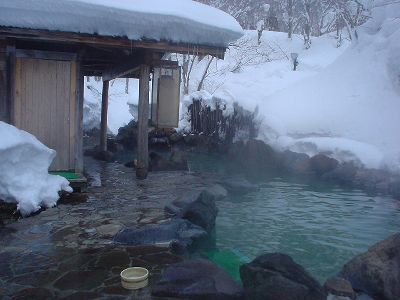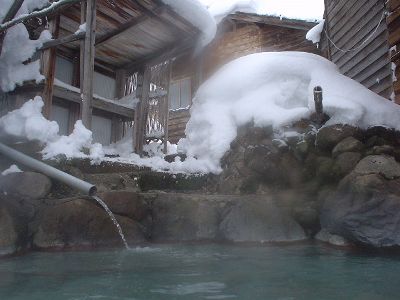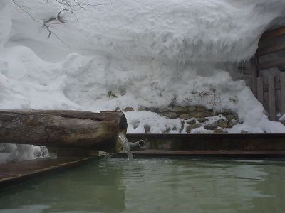 妙の湯温泉の金の湯。泉質は酸性-マグネシウムカルシウム-硫酸塩泉。有馬温泉と似た感じだ。露天は混浴。洗面器に雪を詰め、そこに缶ビールを突っ込んで長期戦を構える強者の夫婦がいた。内湯の銀の湯は単純泉。さ湯か?