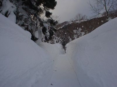 蟹場温泉に戻り、旅館から50m離れた露天風呂に。途中は雪道。