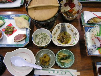 夕食。川魚、じゅんさい、きのこ中心。撮ってないけど朝食もきのこ中心。いぶりがっこはうまかった。