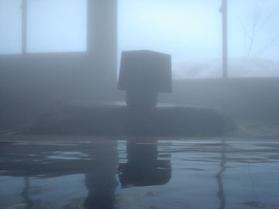 朝の露天風呂。朝食前と朝食後の2回入る。朝食後は関西からの団体客が押し寄せてきてマナーの悪さに辟易。ここは混浴なのだが、「空いてるから」と男性用脱衣所をおばちゃんが占拠。トイレをそうするってのは聞いたことあるが・・・。おっさんも内湯から半裸・館内スリッパで露天まで来るし。