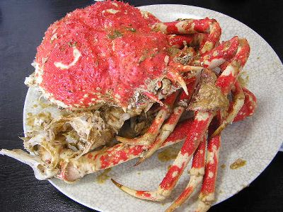 タカアシガニのゆでたの。甲羅の中のミソが全体にぶちまけてあって、エプロンしながらワシワシと食うシステム。