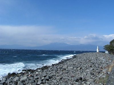 海岸から富士山方向。雲かぶってたのが残念。あと風が強く波も荒かった。