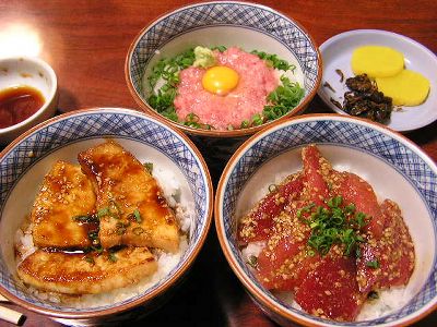 これが「ちりとてちん丼」。ねぎとろと照り焼きとあづま丼(づけ丼)のミニ丼が3つ。お徳。