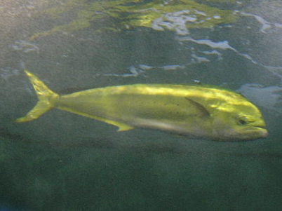 回遊魚水槽を悠々と泳ぐ金色のシイラ。