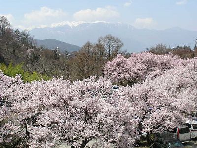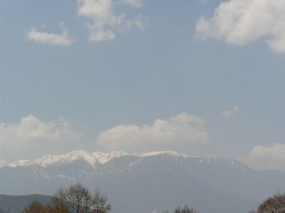 車内アナウンスで起きると渋滞で高遠のバスターミナルまでは行けない、ということで高遠中学校前で途中下車。中学校はトイレを開放、生徒が桜茶をふるまっていた。すばらしい観光対応振り。中学校前から見た中央アルプス。
