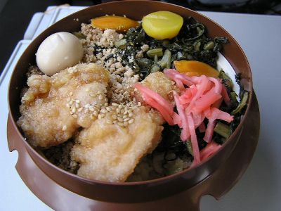 追加の昼飯「とり釜めし」(塩尻駅で販売)。これはうまかった。鶏は煮たのじゃなく天ぷら。野沢菜の油炒めが大量に飯の上に。18時に新宿着。