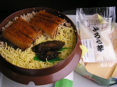 夕飯は岡谷駅の駅弁・うなぎ釜飯。とろろもついてます。