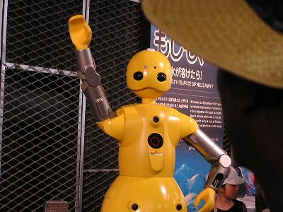 三菱未来館の案内ロボット「wakamaru」。声は合成音声ではなく声優のものだったから、自走型ヴォイスレコーダーという感じしかしない。