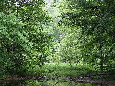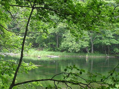 宿泊棟の裏からまずはヒョウタン沼に。その名の通り真ん中でくびれている沼。ここはいかにも「沼」って感じの怪しい雰囲気。