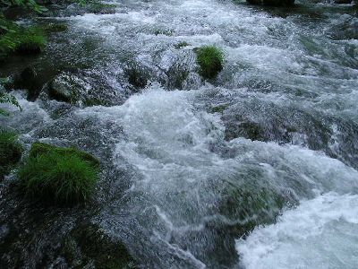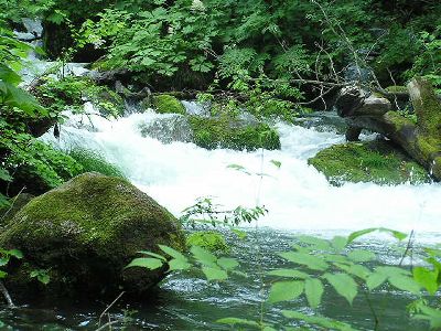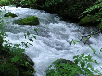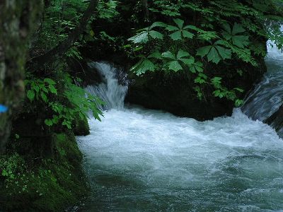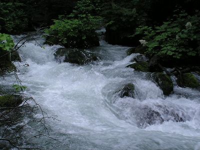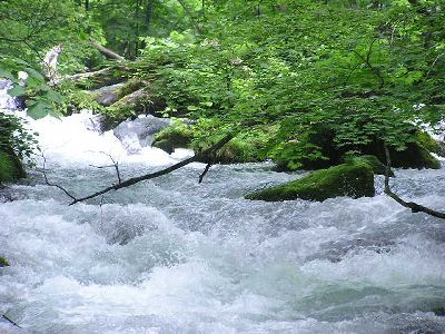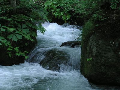 奥入瀬の徒歩の起点は一般的には「石ヶ戸」ということになっている。石ヶ戸にはトイレ、自販機、休憩所もあり観光バスも止まるが、実はそこから1kmほど下ったところに名所の「三乱れの流れ」がある。今回当然そこは外せない。10時50分石ヶ戸でバスを降り、車道を歩いて三乱れの流れに。ここから奥入瀬散策をスタート。石ヶ戸から十和田湖の入り口の子の口までが約9kmということだから全部で約10kmか?